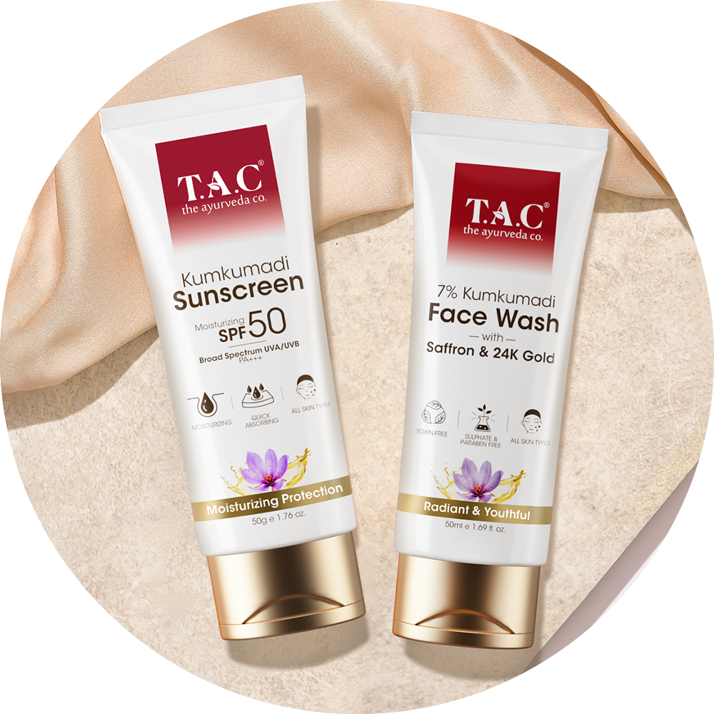 Kumkumadi Sunscreen: Kumkumadi Ext, Rose Extract, Avocado Oil, Raspberry Oil, Carrot Seed Oil, Bala, Manjistha, Vitamin E, Zinc Oxide, Titanium Dioxide, Iso Propyl Myristate, Olivem 1000, Sodium Benzoate, Potassium Sorbate, Stearic Acid, Xanthan Gum Kumkumadi Face Wash: Kumkumadi Ext, Gold Dust, Manjistha, Moringa, Rose Powder, Bala Ext, Sandalwood Ext, Aloe Vera Ext, Orange Peel Ext, Tulsi Powder Ext, Sodium Lauryl Sarcosinate, Coco- Glucoside, Decyl Glucoside, Cocamidopropyl Betaine, Sorbitol, Polyquaternium 7, DMDM Hydantoin, Cocodiethanol Amide, Methylchloroisothiazolinone, DM Water.
