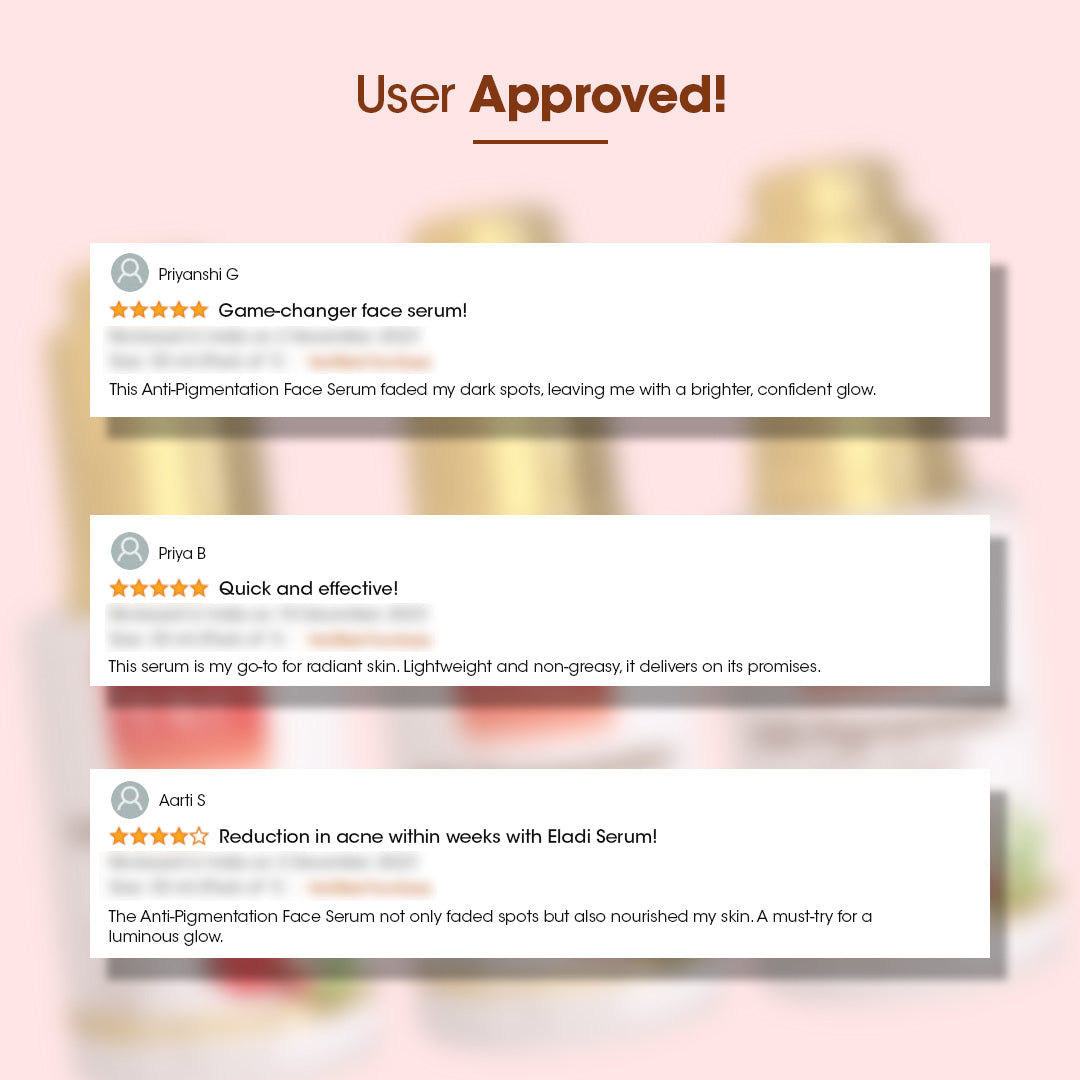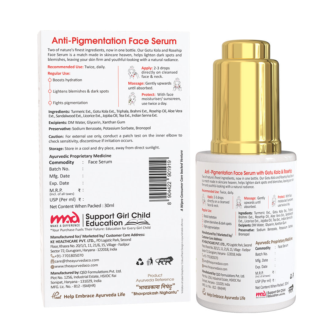 Turmeric Extract, Gotu Kola Extract, Triphala Extract, Brahmi Extract, Rosehip Oil, Aloe Vera Extract, Sandalwood Extract, Licorice Extract, Jojoba Oil, Tea Extract, Indian Senna Extract Excipients: DM Water, Glycerin, Xanthan Gum Preservative: Sodium Benzoate, Potassium Sorbate, Bronopol