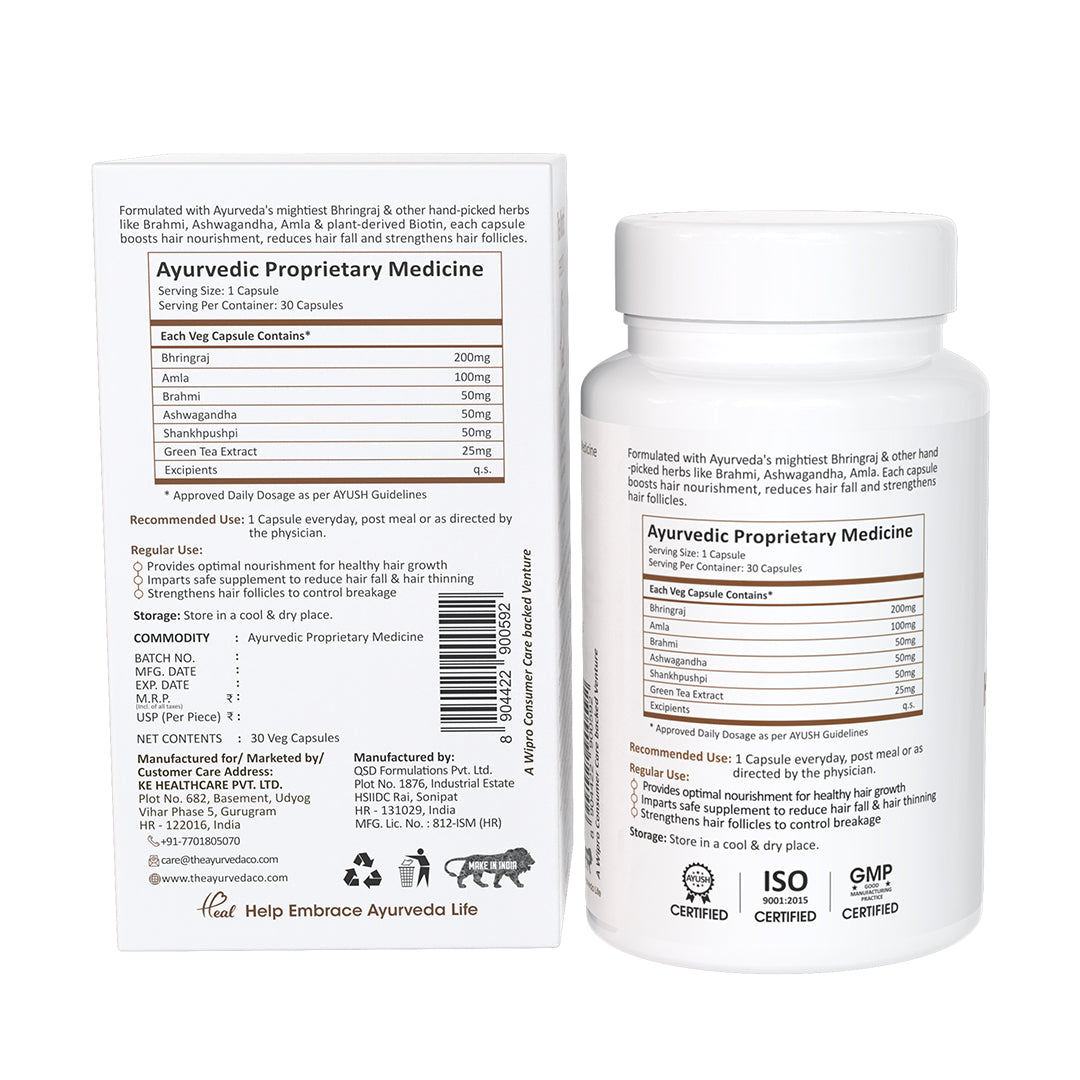 Each Veg Capsule Contains: Bhringraj-200mg Shankhpushpi-50mg Brahmi-50mg Ashwagandha-50mg Biotin-30mcg Amla-100mg Green Tea Extract-25mg Hyaluronic Acid-30mg