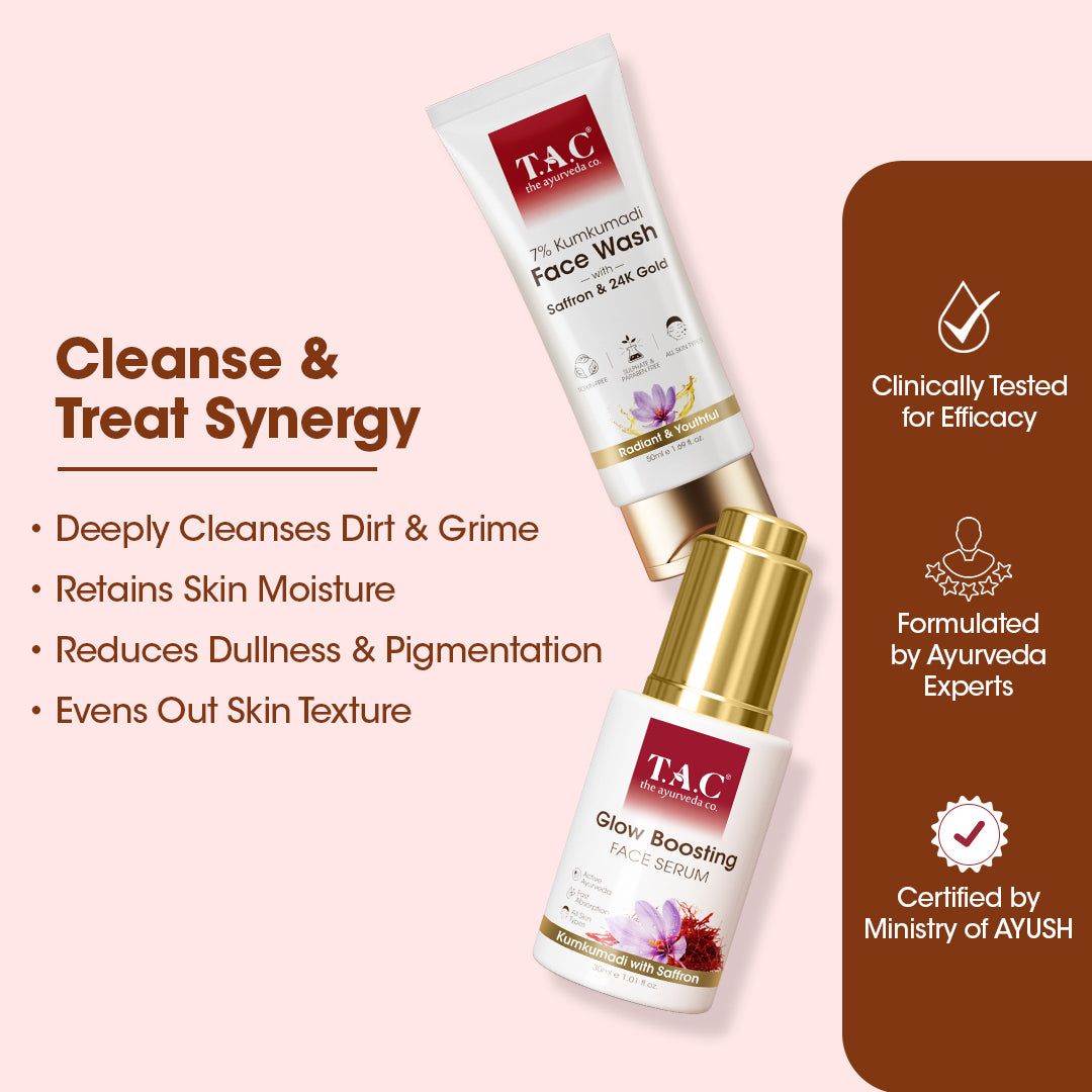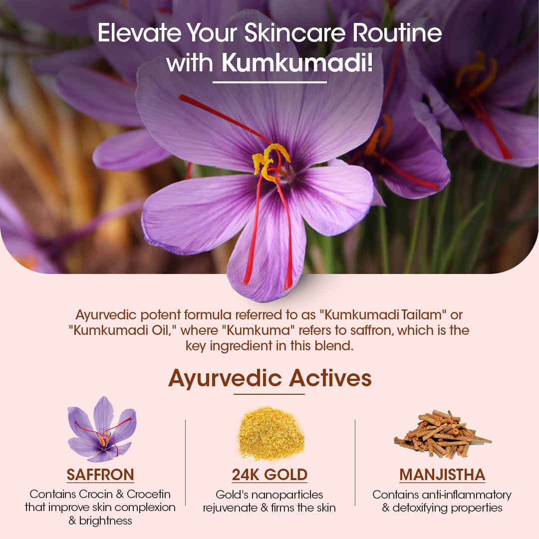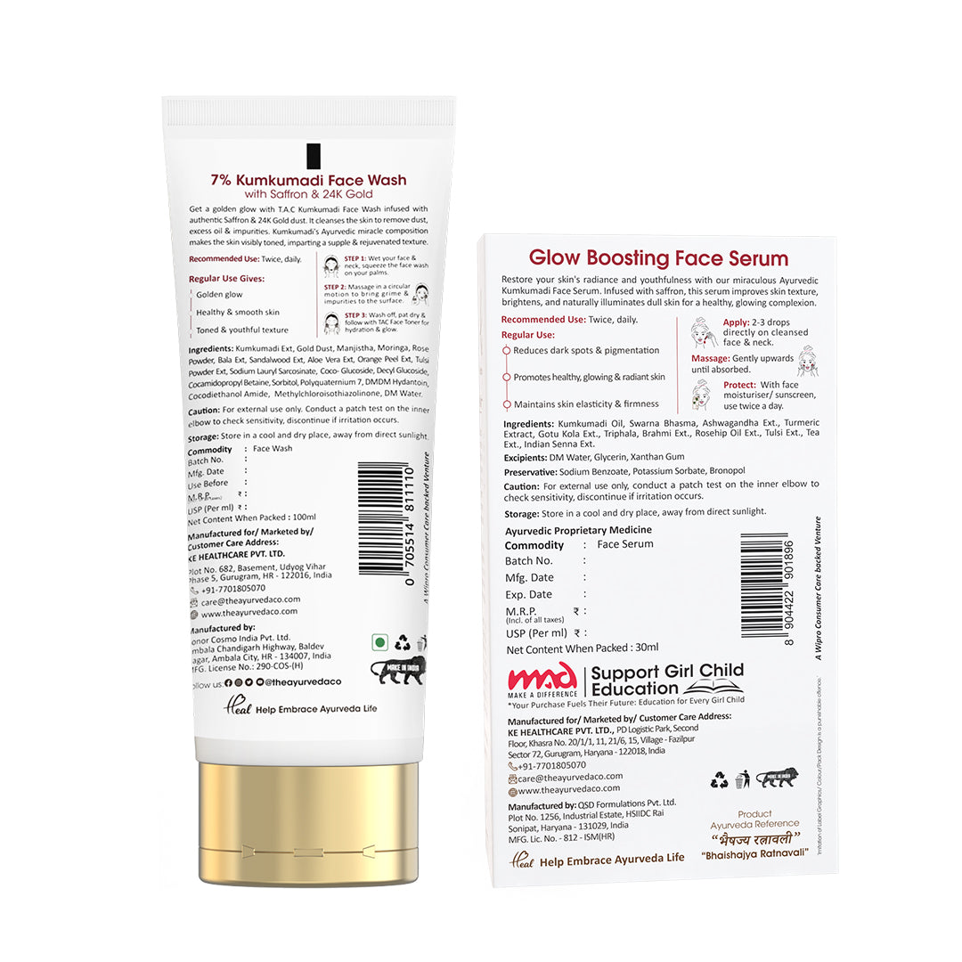 Glow Boosting Face Serum: Kumkumadi Extract, Gold Dust, Ashwagandha Extract, Turmeric Extract, Gotu Kola Extract, Triphala Extract, Brahmi Extract, Rosehip Oil Extract, Tulsi Extract, Tea Extract, Indian Senna Extract Excipients: DM Water, Glycerin, Xanthan Gum Preservative: Sodium Benzoate, Potassium Sorbate, Bronopol Kumkumadi Face Wash: Kumkumadi Ext, Gold Dust, Manjistha, Moringa, Rose Powder, Bala Ext, Sandalwood Ext, Aloe Vera Ext, Orange Peel Ext, Tulsi Powder Ext, Sodium Lauryl Sarcosinate, Coco- Glucoside, Decyl Glucoside, Cocamidopropyl Betaine, Sorbitol, Polyquaternium 7, DMDM Hydantoin, Cocodiethanol Amide, Methylchloroisothiazolinone, DM Water.