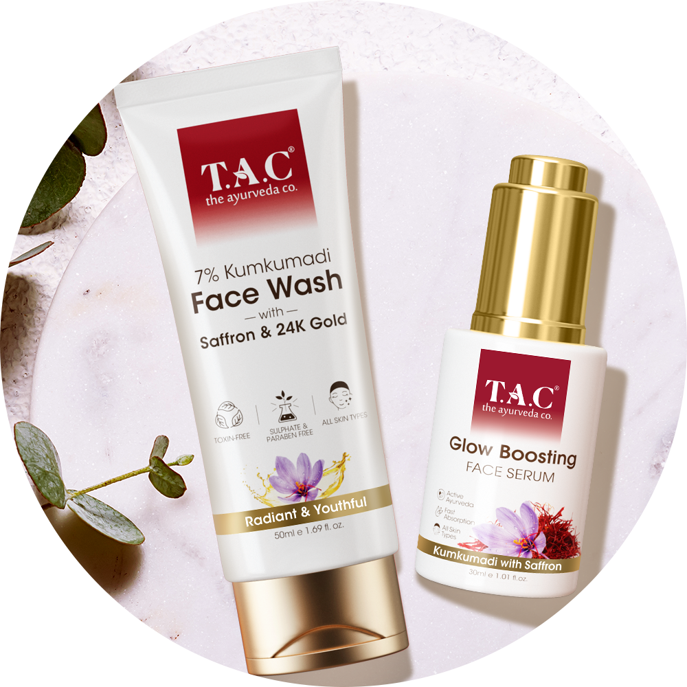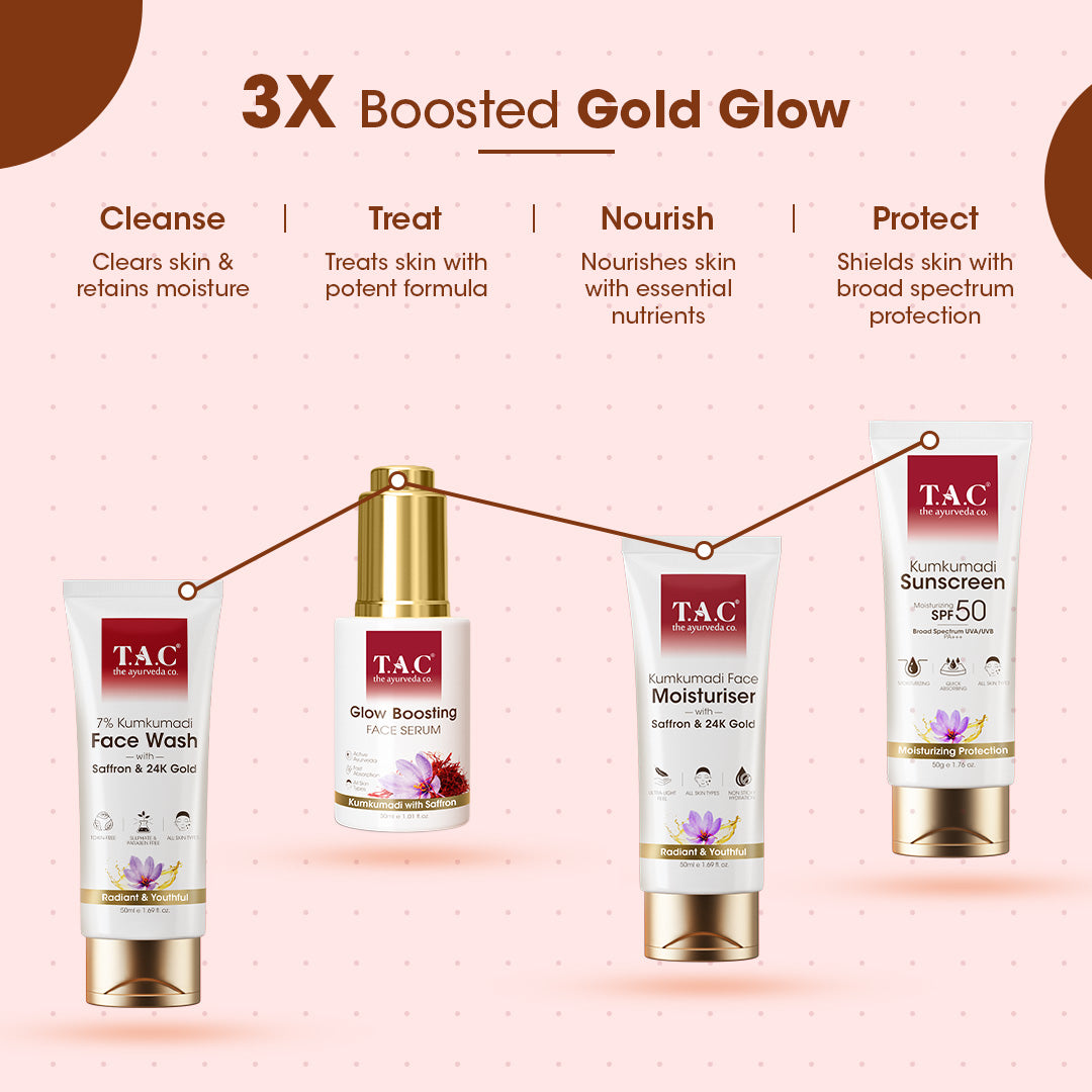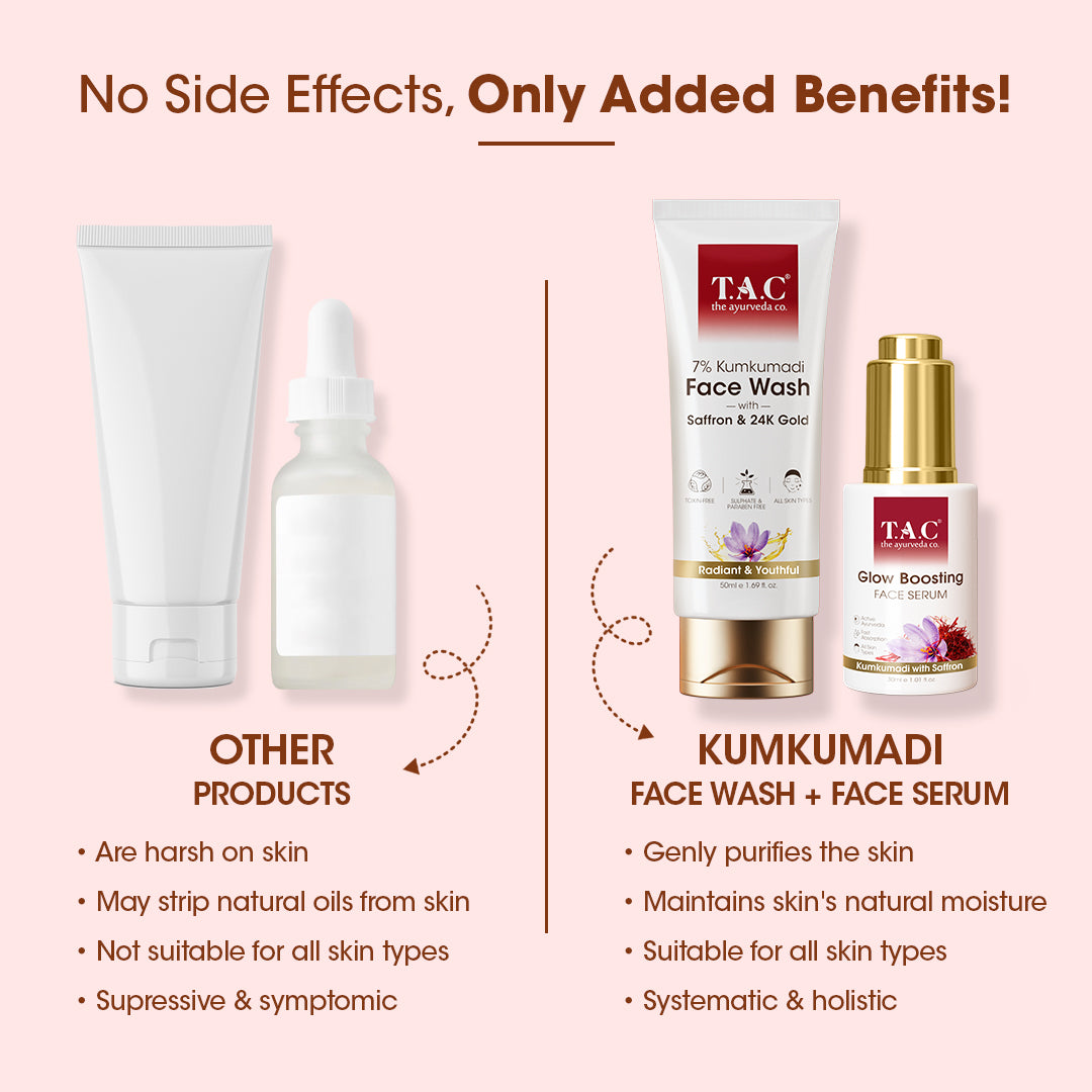 Glow Boosting Face Serum: Kumkumadi Extract, Gold Dust, Ashwagandha Extract, Turmeric Extract, Gotu Kola Extract, Triphala Extract, Brahmi Extract, Rosehip Oil Extract, Tulsi Extract, Tea Extract, Indian Senna Extract Excipients: DM Water, Glycerin, Xanthan Gum Preservative: Sodium Benzoate, Potassium Sorbate, Bronopol Kumkumadi Face Wash: Kumkumadi Ext, Gold Dust, Manjistha, Moringa, Rose Powder, Bala Ext, Sandalwood Ext, Aloe Vera Ext, Orange Peel Ext, Tulsi Powder Ext, Sodium Lauryl Sarcosinate, Coco- Glucoside, Decyl Glucoside, Cocamidopropyl Betaine, Sorbitol, Polyquaternium 7, DMDM Hydantoin, Cocodiethanol Amide, Methylchloroisothiazolinone, DM Water.