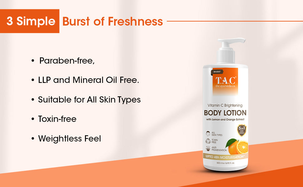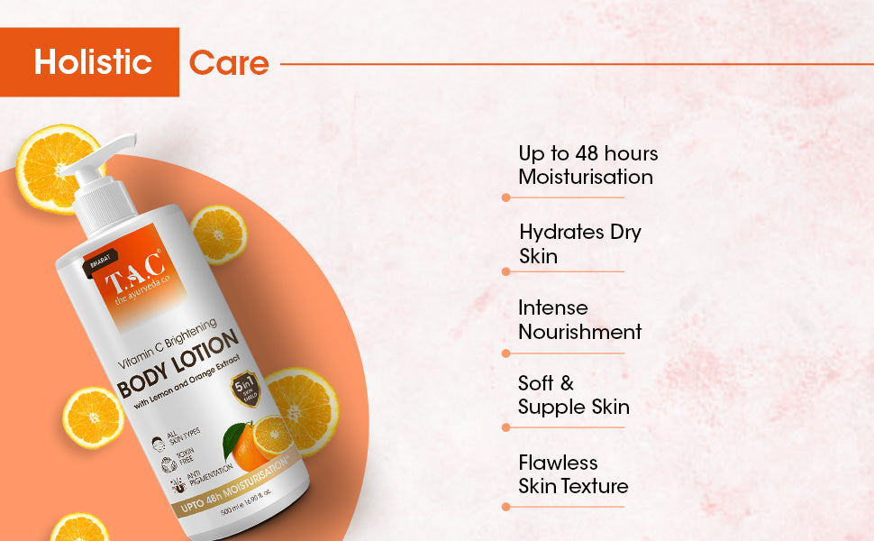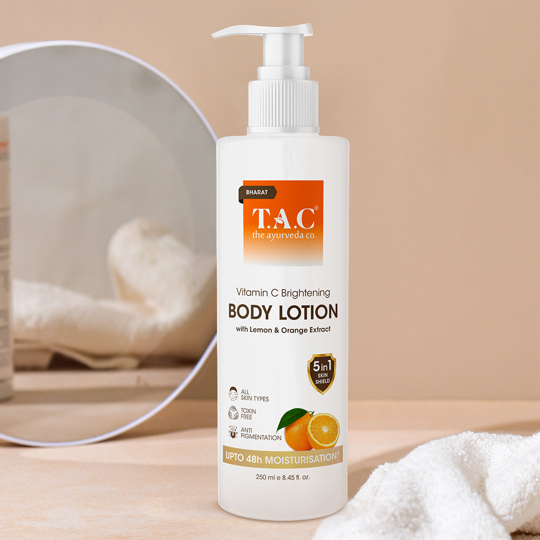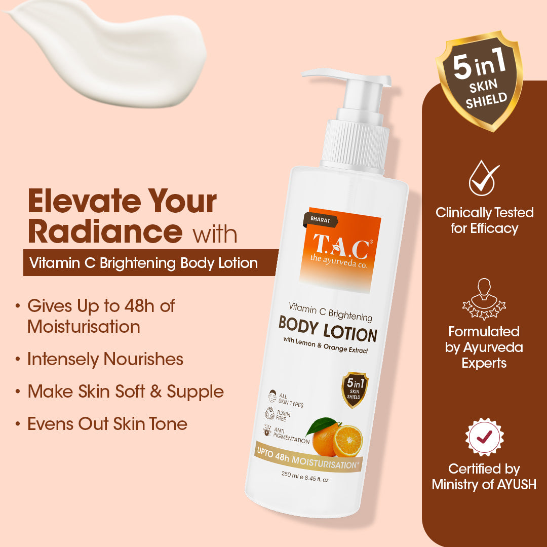 Elevate your glow with T.A.C's Vitamin C Brightening Body Lotion. Say goodbye to dark spots and pigmentation as it infuses your skin with the radiant power of Vitamin C. Experience deep nourishment and 48 hours of enduring moisture.