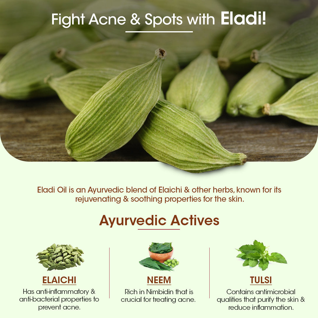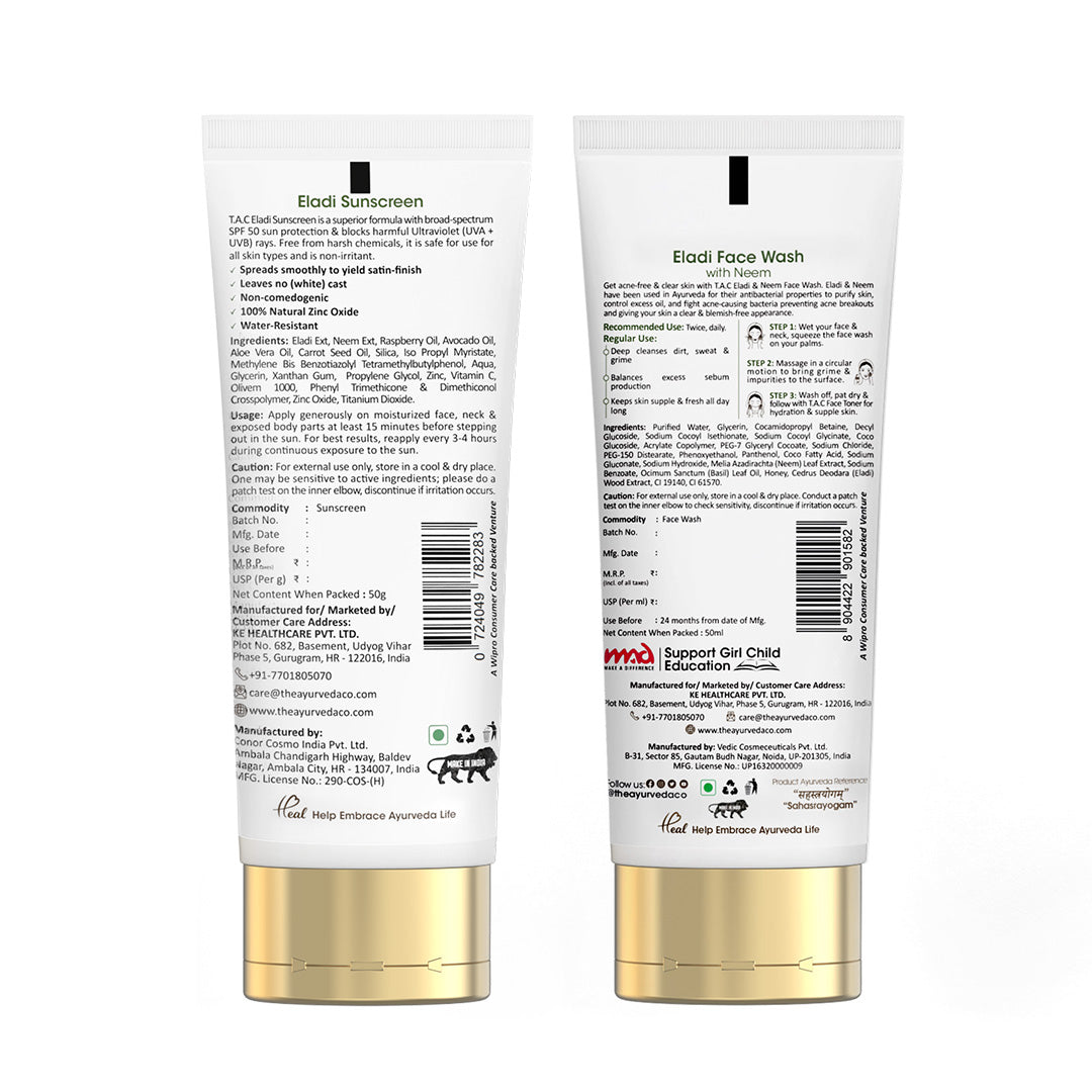 Eladi Sunscreen: Eladi Ext, Neem Ext, Raspberry Oil, Avocado Oil, Aloe Vera Oil, Carrot Seed Oil, Silica, Iso Propyl Myristate, Methylene Bis Benzotiazolyl Tetramethylbutylphenol, Aqua, Glycerin, Xanthan Gum, Propylene Glycol, Zinc, Vitamin C, Olivem 1000, Phenyl Trimethicone & Dimethiconol Crosspolymer, Zinc Oxide, Titanium Dioxide. Eladi Face Wash: Purified Water, Glycerin, Cocamidopropyl Betaine, Decyl Glucoside, Sodium Cocoyl Isethionate, Sodium Cocoyl Glycinate, Coco Glucoside, Acrylate Copolymer, PEG-7 Glyceryl Cocoate, Sodium Chloride, PEG-150 Distearate, Phenoxyethanol, Panthenol, Coco Fatty Acid, Sodium Gluconate, Sodium Hydroxide, Melia Azadirachta (Neem) Leaf Extract, Sodium Benzoate, Ocimum Sanctum (Basil) Leaf Oil, Honey, Cedrus Deodara (Eladi) Wood Extract, CI 19140, CI 61570.