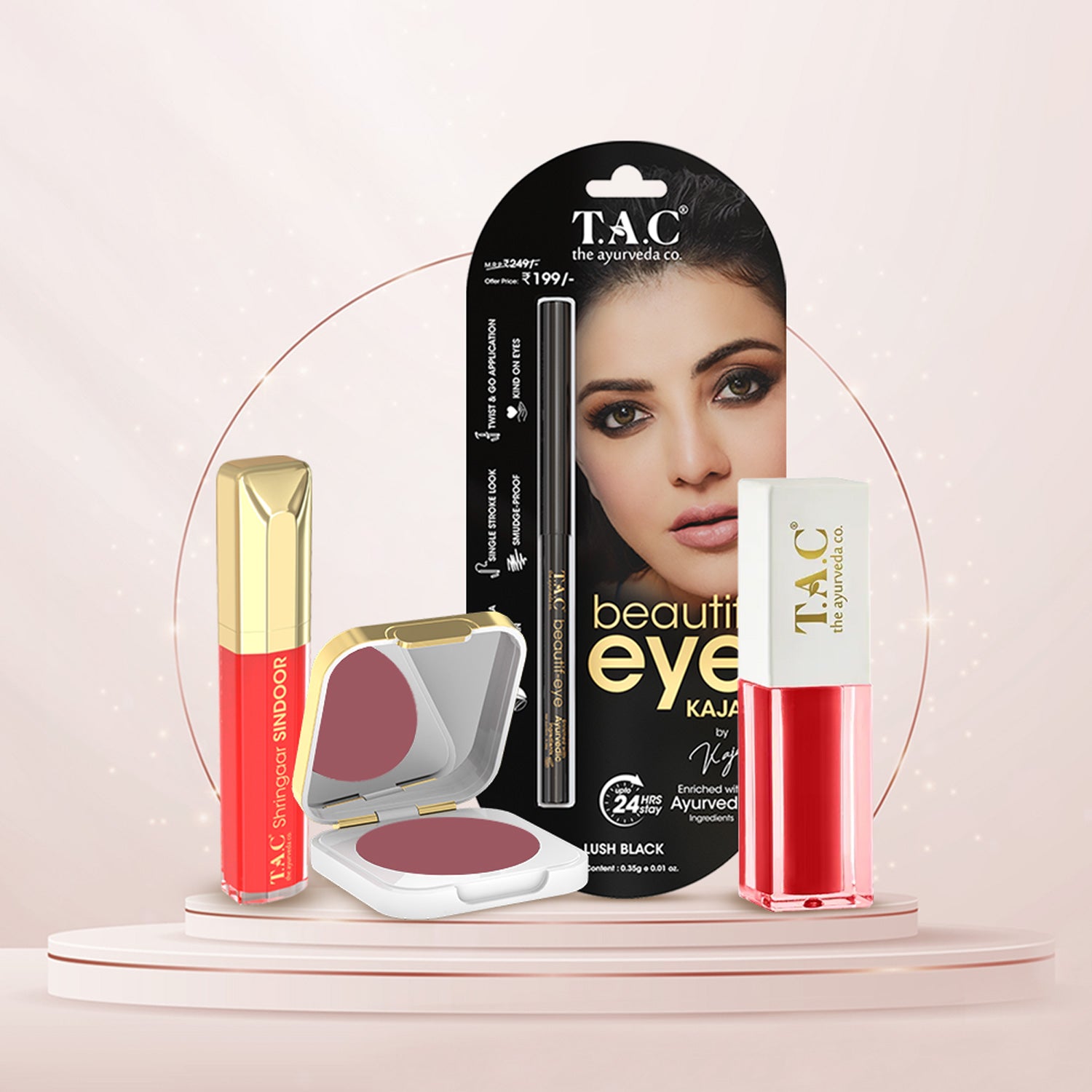Elevate your beauty with our Shringaar Set, a harmonious blend of tradition and modern elegance. The iconic Ayurvedic Sindoor boasts a rich, quick-drying, smudge-proof formula while being gentle on your skin. The Beautif-eye Lush Black Ayurvedic Kajal offers an enduring definition for captivating eyes. Our Liquid Lipsticks provide a matte, moisturised, and long-lasting finish, staying true to their colour and being kind to your skin. Don't miss the versatile Lip, Cheek, and Eye Tint, a touch of radiance infused with natural extracts.