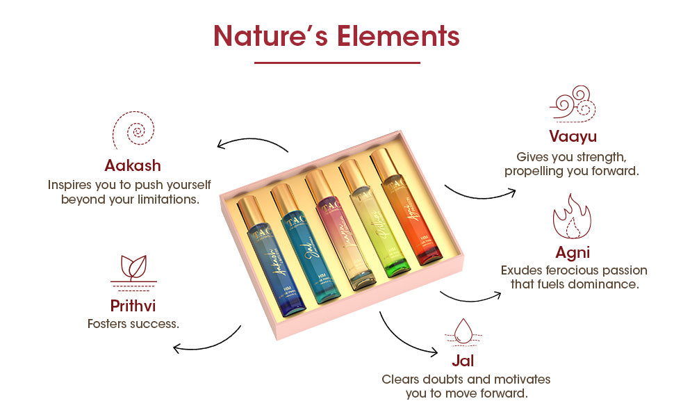 Ever delved into the heart of Ayurveda? For that splendor, try Aakash, and for a breath of fresh air, choose Vaayu. Allow the warmth of Agni to embrace you, float with the flow of Jal, and anchor yourself in the timeless essence of Prithvi. These are not merely fragrances; rather, they are natural ingredients based on Ayurvedic knowledge. Discover the true balance. It sounds nice, doesn't it?