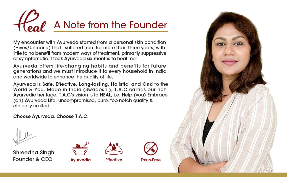 CHOOSE AYURVEDA, CHOOSE T.A.C - Ayurveda is Safe, Effective, Long Lasting, Holistic, and, Kind to the World & You. T.A.C products are proudly Made in India (Swadeshi), and carry the rich Ayurvedic heritage of India.