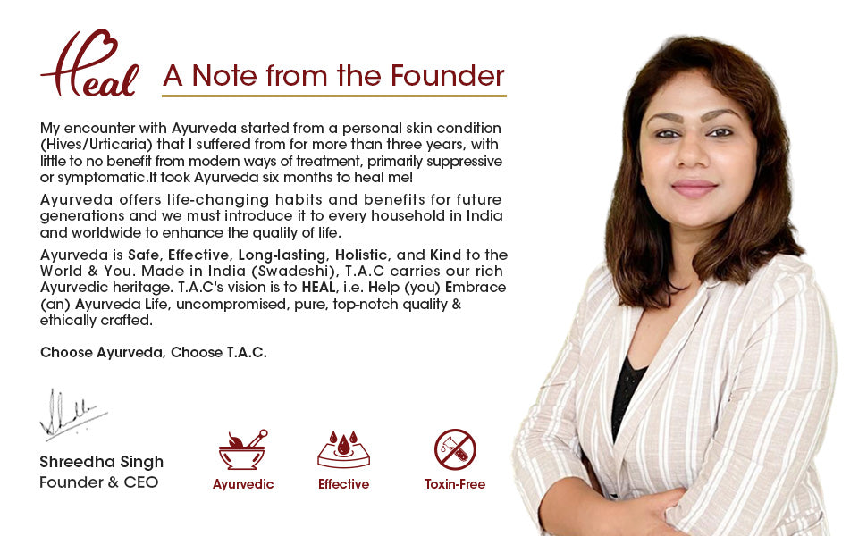 CHOOSE AYURVEDA, CHOOSE T.A.C - Ayurveda is Safe, Effective, Long Lasting, Holistic, and, Kind to the World & You. T.A.C products are proudly Made in India (Swadeshi), and carry the rich Ayurvedic heritage of India.