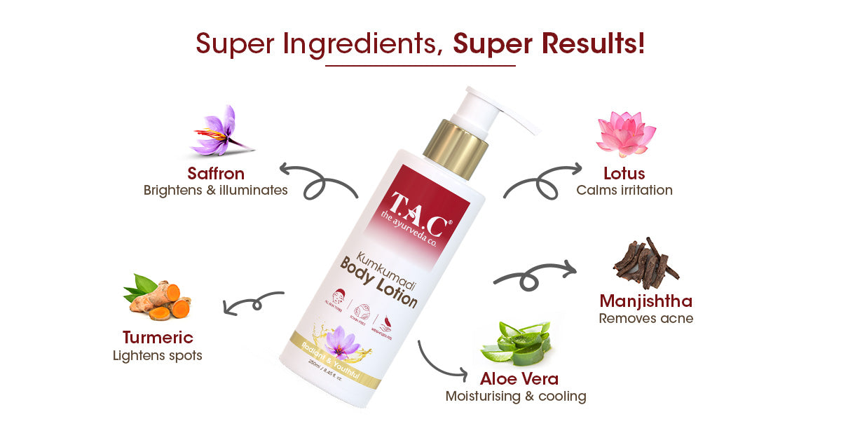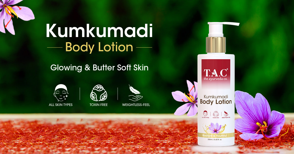 - GOODNESS OF AYURVEDIC HERBS: Blended with kumkumadi, Red Sandalwood, Multani Mitti, and other skin hydrating herbs, the body lotion for women and men helps in skin healing and rejuvenation.