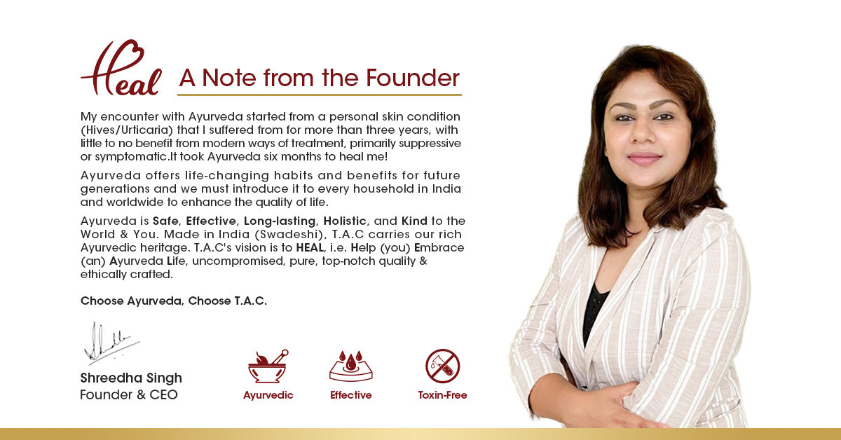 - CHOOSE AYURVEDA, CHOOSE T.A.C;Ayurveda is Safe, Effective, Long Lasting, Holistic, and, Kind to the World You. T.A.C products are proudly Made in India (Swadeshi) and carry the rich Ayurvedic heritage of India.