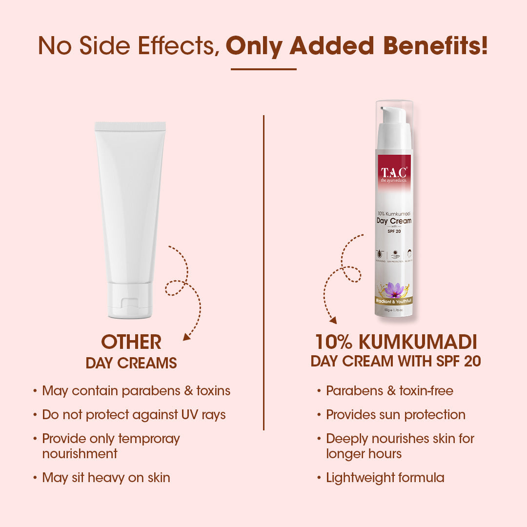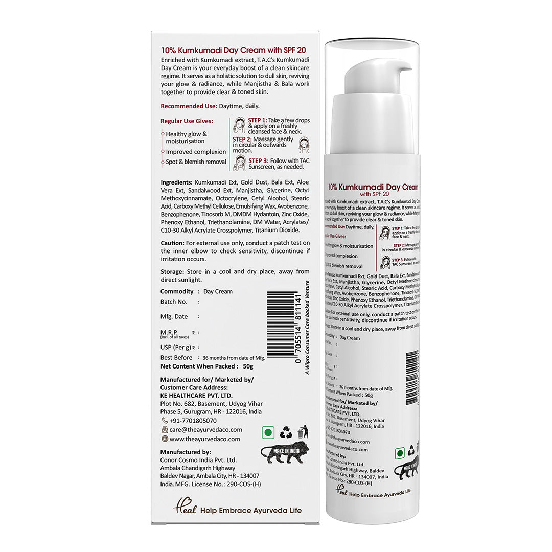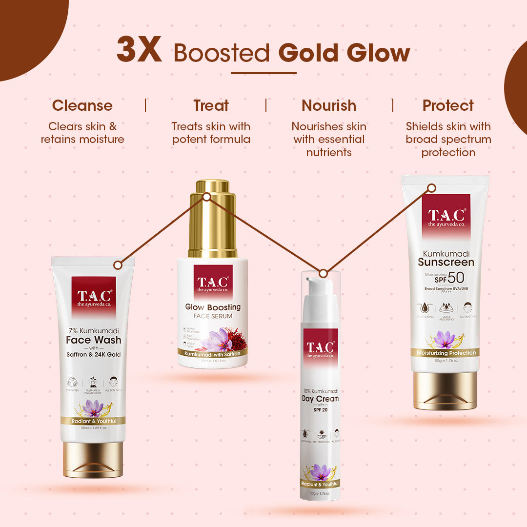Kumkumadi Ext, Gold Dust, Bala Ext, Sandalwood Ext, Aloe Vera Ext, Manjistha, Glycerine, Octyl Methoxycinnamate, Octocrylene, Cetyl Alcohol, Stearic Acid, Carboxy Methyl Cellulose, Emulsifying Wax, Avobenzone, Benzophenone, Tinosorb M, DMDM Hydantoin, Zinc Oxide, Phenoxy Ethanol, Triethanolamine, DM Water, ULTREZ 20, Titanium Dioxide