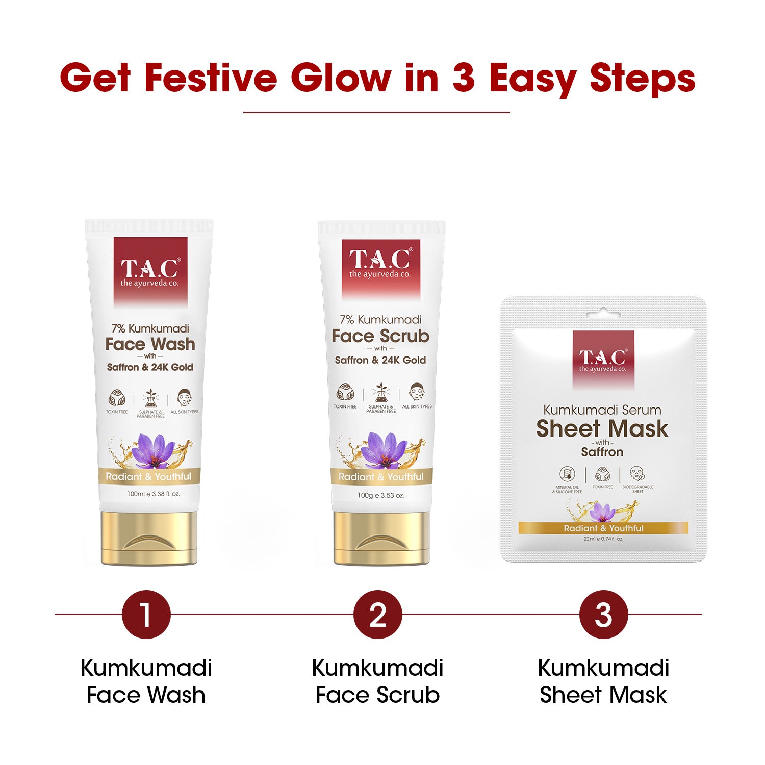 Elevate your skincare with our Kumkumadi Festive Glow Kit. Enriched with 24K Gold Dust, these products cleanse, exfoliate, and rejuvenate your skin, offering a golden glow, toned pores, and youthful texture. Experience Ayurveda's magic in one package.