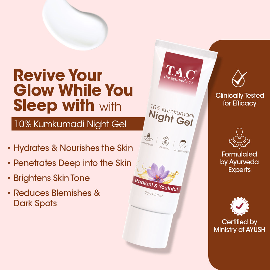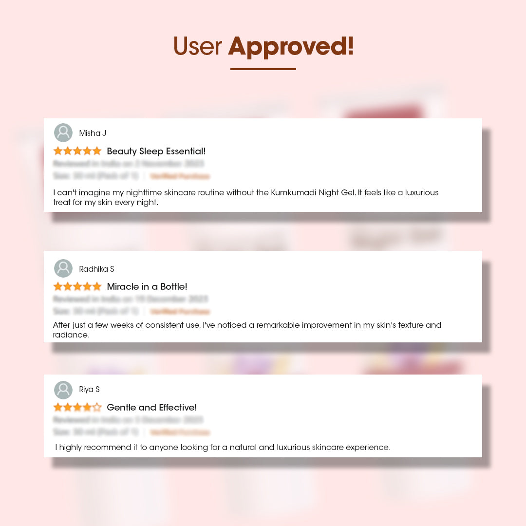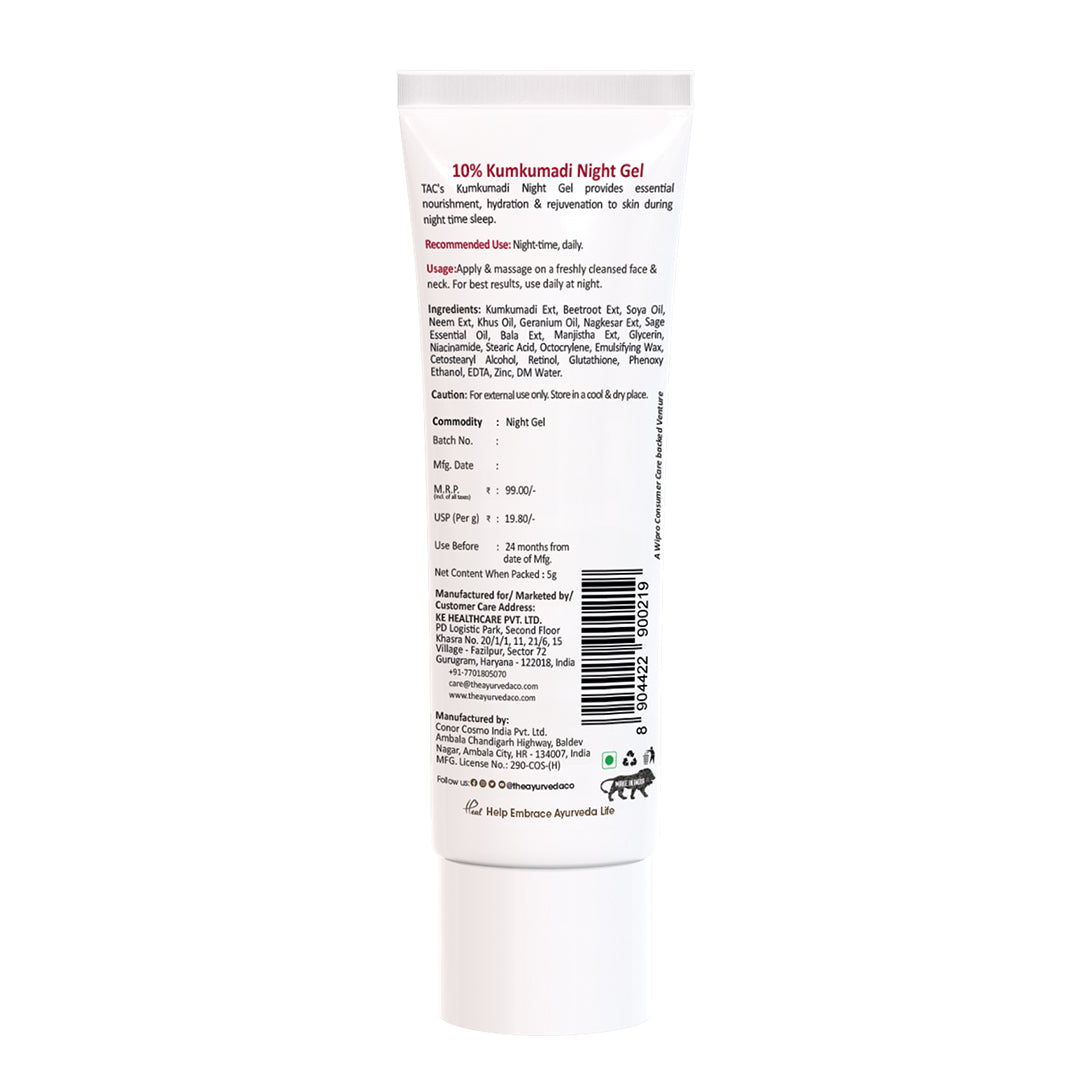 Kumkumadi Ext, Beetroot Ext, Soya Oil, Neem Ext, Khus Oil, Geranium Oil, Nagkesar Ext, Sage Essential Oil, Bala Ext, Manjistha Ext, Glycerin, Stearic Acid, Niacinamide, Octocrylene, Emulsifying Wax, Cetostearyl Alcohol, Retinol, Glutathione, Phenoxy Ethanol, EDTA, Zinc, DM Water.