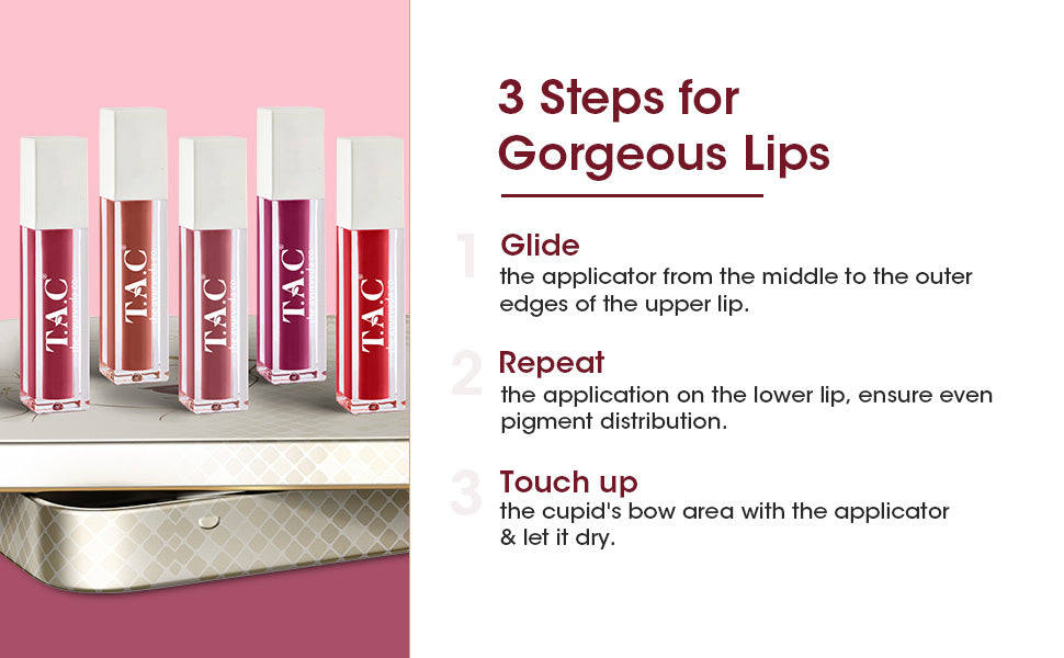 SMUDGE-PROOF AND KISS-PROOF: Kiss your bae, sip or eat anything without leaving a proof with T.A.C Liquid Lipsticks. Its smudge-proof formula stays for long without leaving a mark