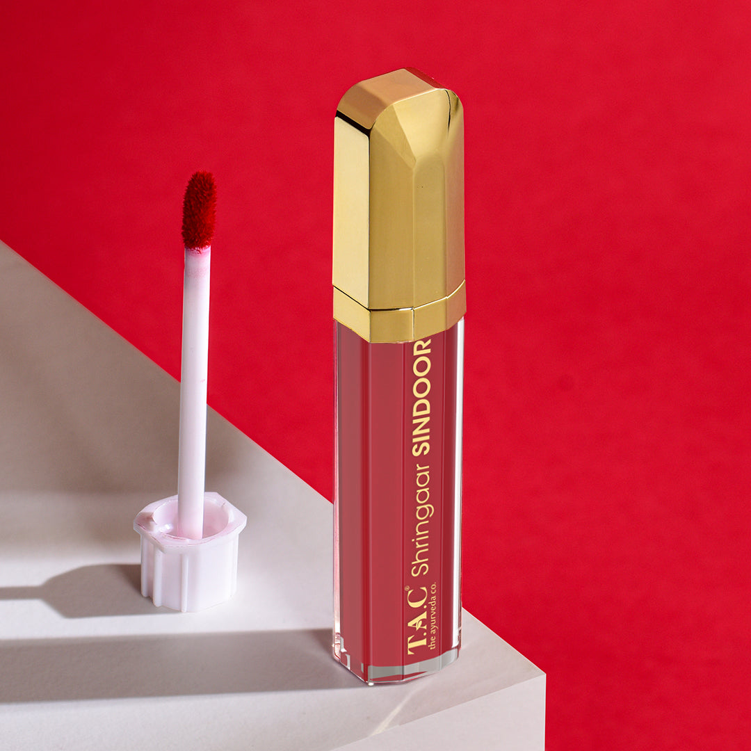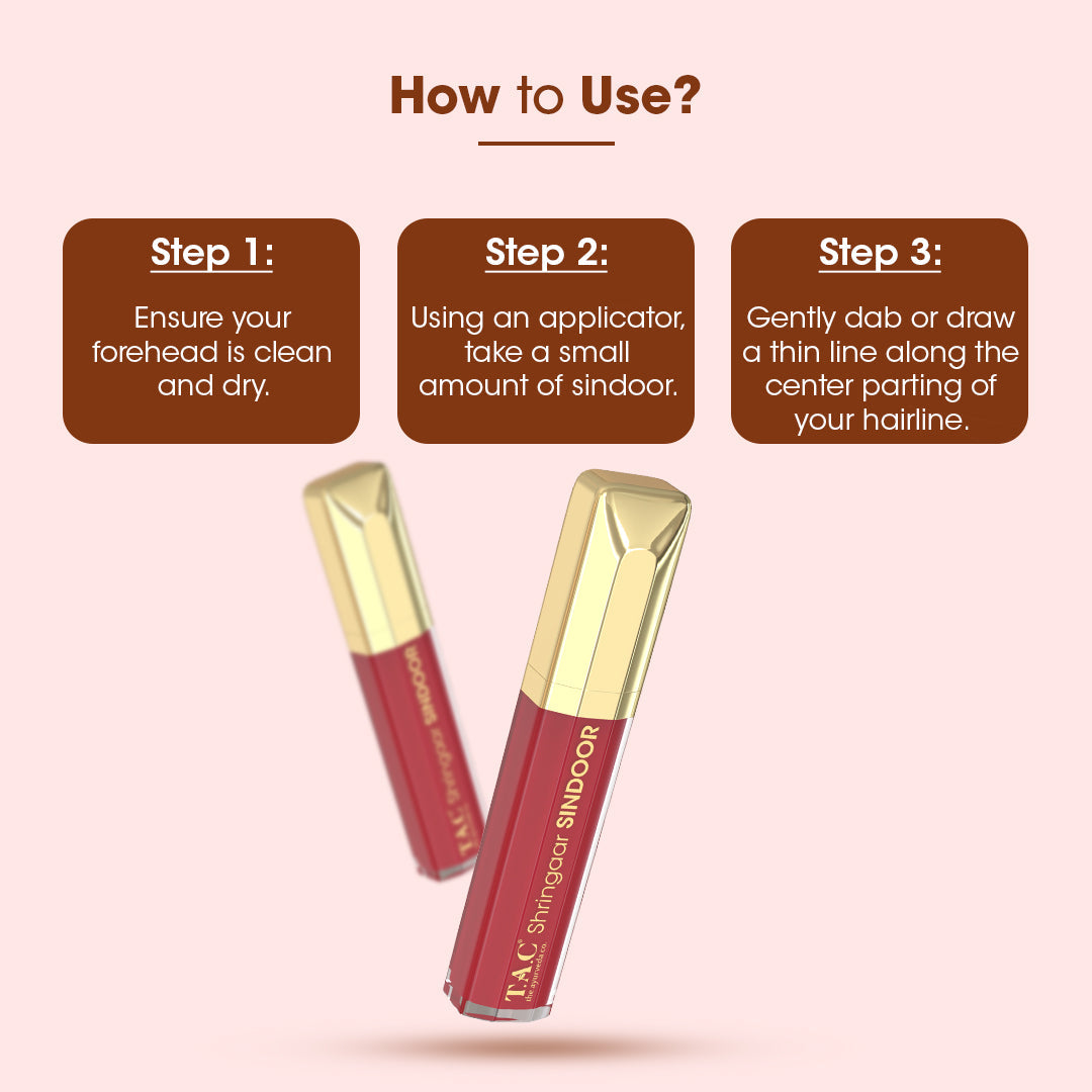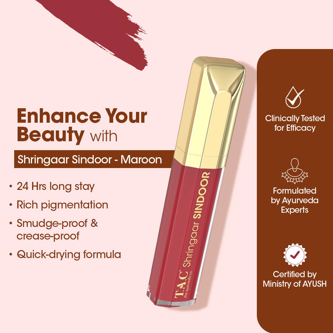 AUSPICIOUS SINDOOR: With ayurvedic herbs blended within, the liquid-based T.A.C Sindoor accentuates a married woman's beauty with the love of tradition.